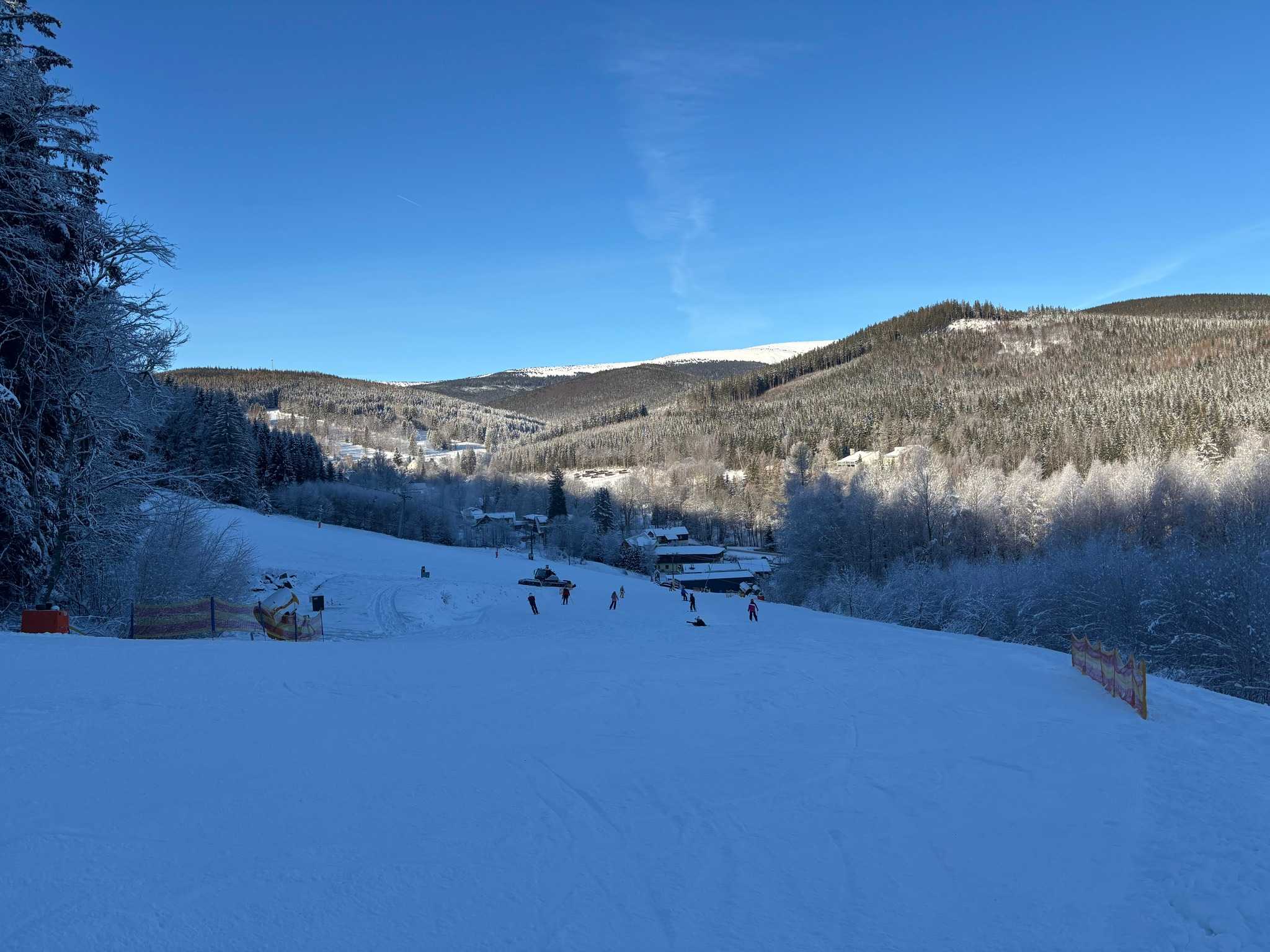 Výhledy, sníh, sluníčko, modrá Family a lyžařská škola. Ke 30 až 40 cm technického sněhu přibylo asi 20 cm přírodního. Vše funguje, půjčovna, servis, bufety - však to znáte. A jestli se k nám chystá...